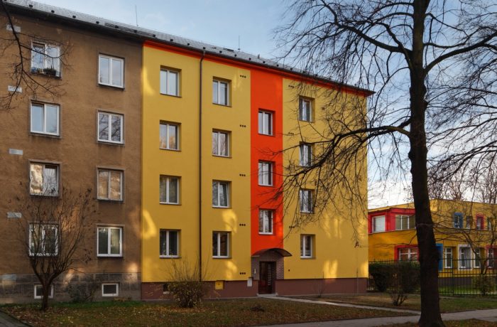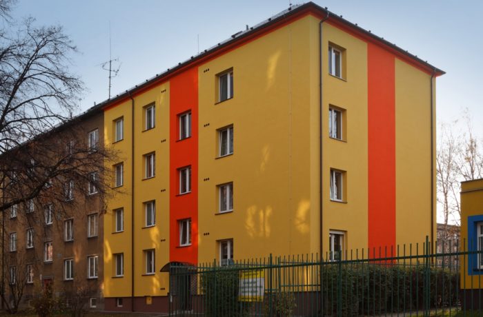 Zateplení stěn obvodového pláště domu, zateplení soklu, zateplení římsy, kompletní výměna klempířských prvků, dodávka a montáž nových zábradlí, realizace 2015